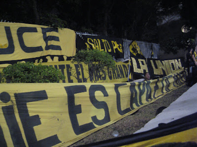 Vieram os uruguayos e logo ocuparam toda a arquibancada lilás. Nunca antes aquele setor ficou tão lotado quanto na noite de ontem - nem mesmo quando os grandes da capital ficam ali. Longe de aceitar as imposições dos coxinhas, os hinchas enfileiraram seus trapos por todos os cantos: na grade lá embaixo, na corda dos coxinhas, na marquise lá do alto, nas árvores, nos postes de iluminação, nas laterais com acesso normalmente proibido para os visitantes.